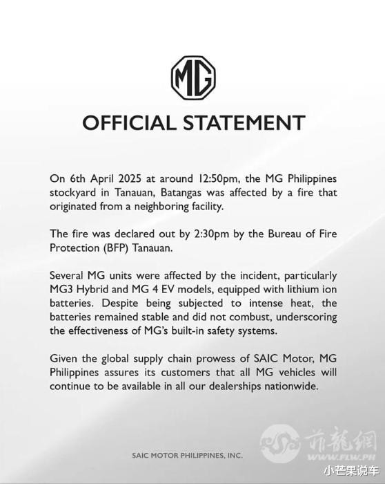 当菲律宾八打雁省工业园区的监控摄像头记录下第一缕黑烟时,谁也没想到这场大火会成为全球汽车工业的“另类实验室”。4月6日午后,200辆崭新的MG名爵汽车在热浪中接受了一场没有脚本的极限测试——这场由食用油残渣引发的意外,不仅让200台新车化为焦黑骨架,更意外验证了中国电动车的安全底线:在摄氏800度的火场核心,MG4 EV的锂离子电池组始终沉默如金。